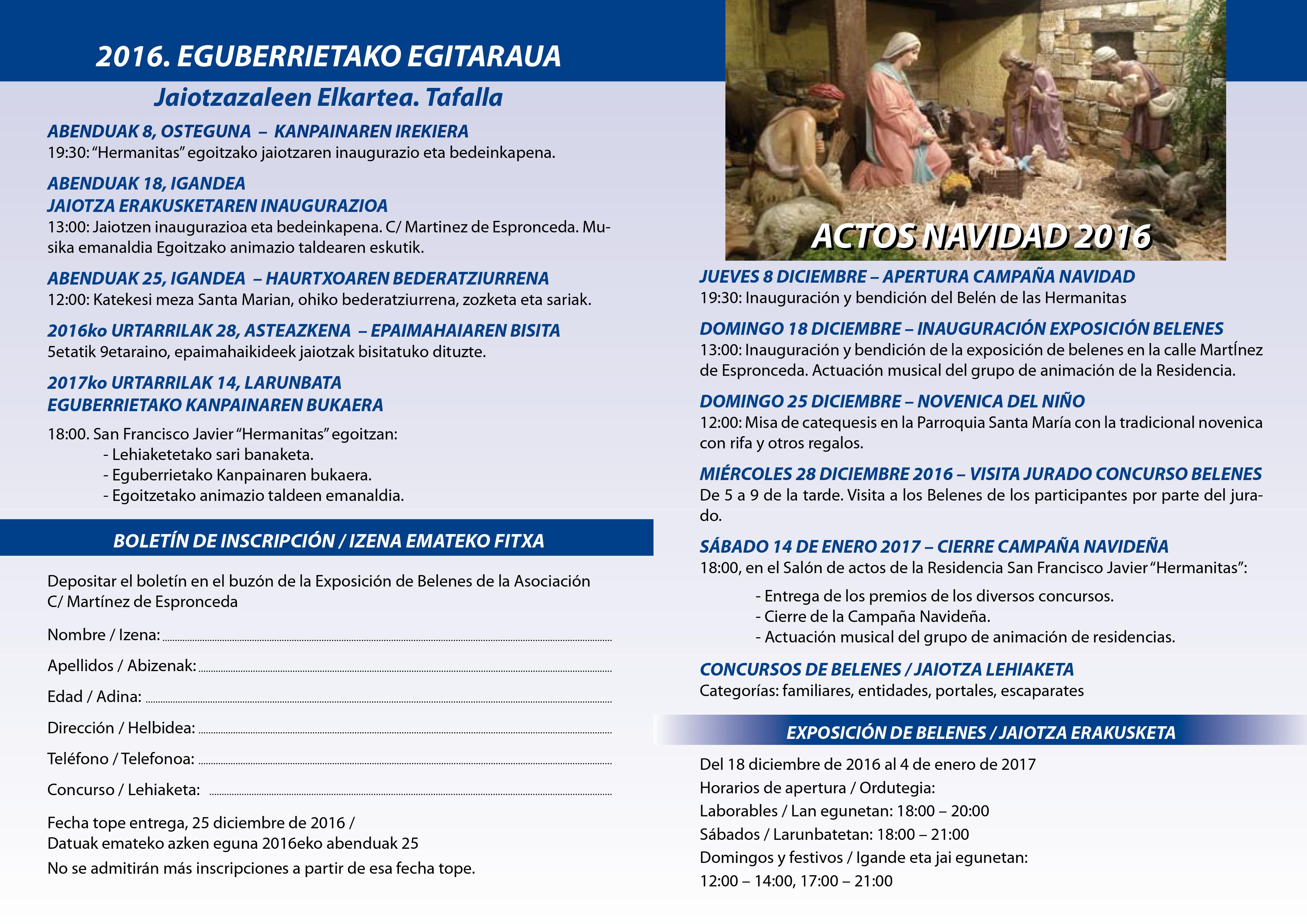 Este año en Navidades abriremos la exposición aunque en precario pero no faltaran los belenes, no serán nuestros, serán de las Asociaciones Belenistas de Navarra pero Tafalla contará con una exposición de Belenes como en años anteriores y con la firme promesa de que la próxima campaña esté ya el local en perfecto estado y en funcionamiento y ya con belenes nuestros